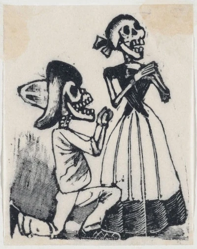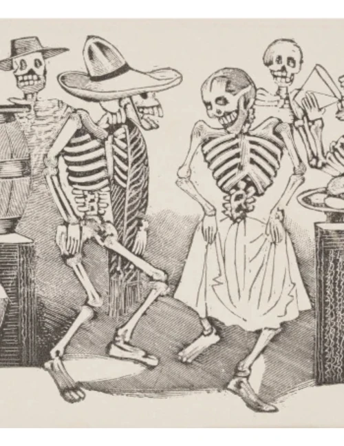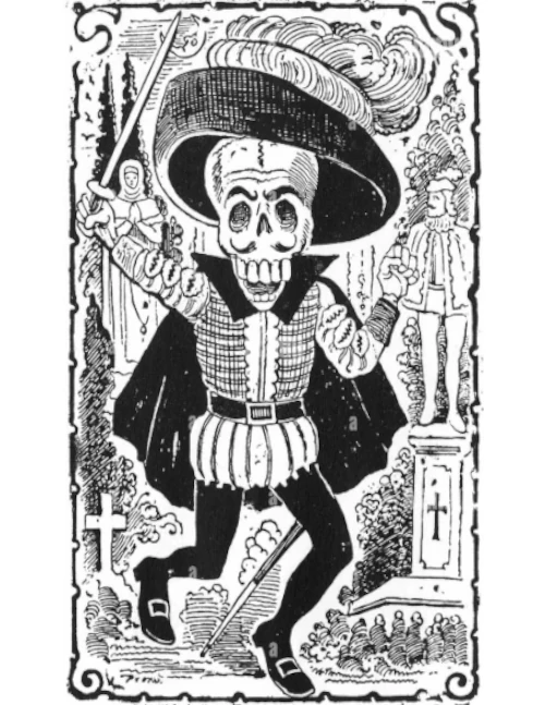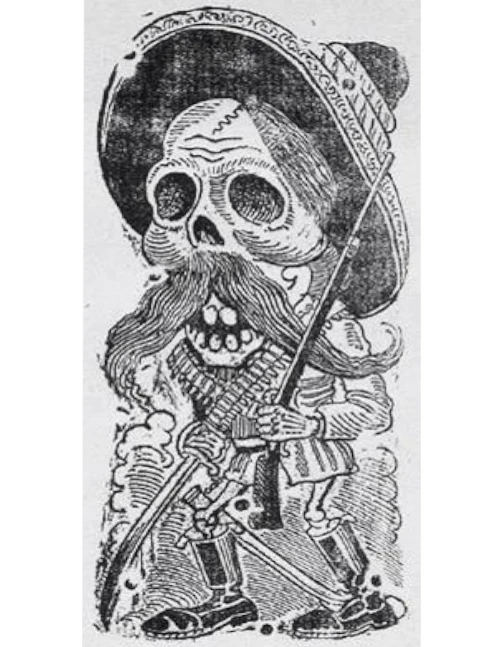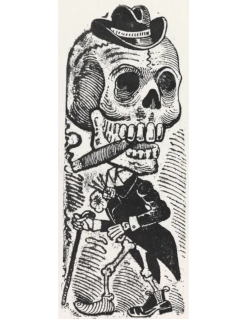 To understand Posada’s criticism of social inequality, one must examine his use of death as a recurring subject. His message is clear: regardless of wealth, education, or social status, all individuals share the same inevitable fate. In death, everyone becomes equal—reduced to bone. From this premise, Posada created a wide range of satirical skulls representing authorities, revolutionaries, peasants, and merchants alike. Among them, one figure stands out above all others: La Catrina Garbancera. The term catrina derives from the masculine catrín, referring to a person of high social standing, while garbancera comes from garbanzo (chickpea), alluding to Indigenous women who sought to conceal their origins by selling chickpeas instead of the more common corn in an attempt to appear aristocratic.